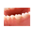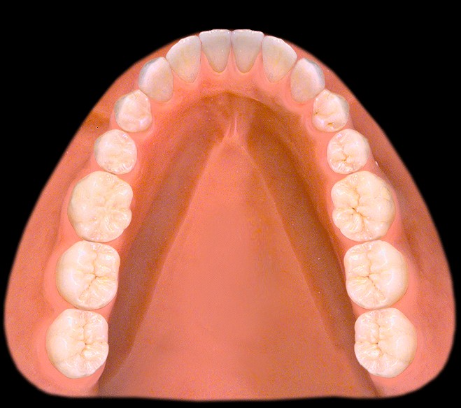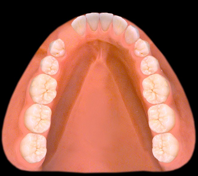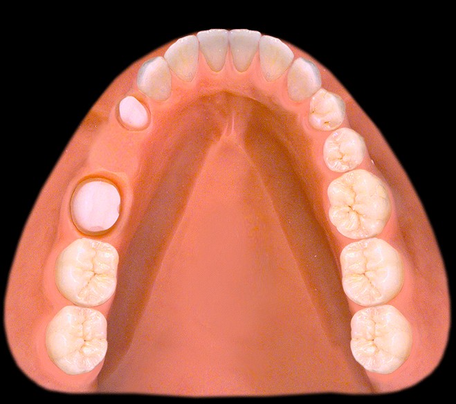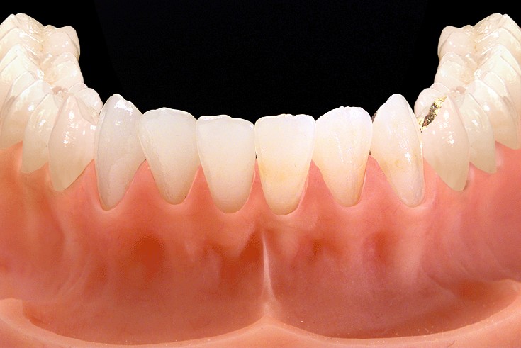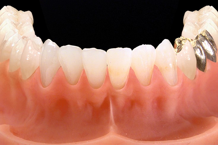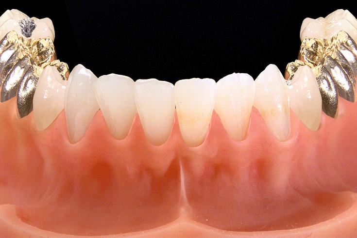 Versorgung der Lücke mit einer Brücke, die vestibulär ( außen ) verblendet ist. Metallanteile auf der Zungenseite sind sichtbar.