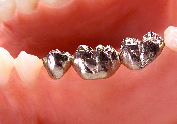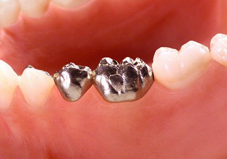 Versorgung der Lücke mit einer Brücke, nach der Verblendgrenze. Die Kronen bestehen aus einer Metallegierung. Es ist überall Metall zu sehen. ( = Gußkronen )