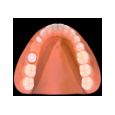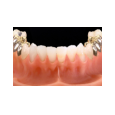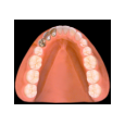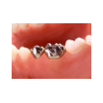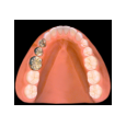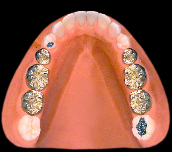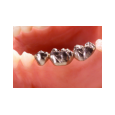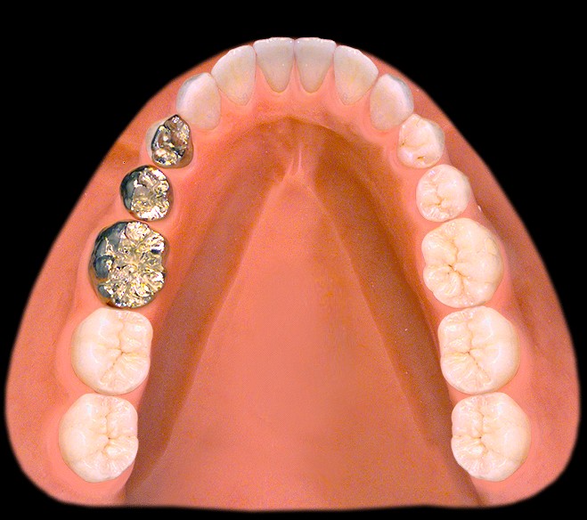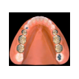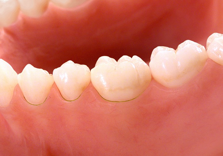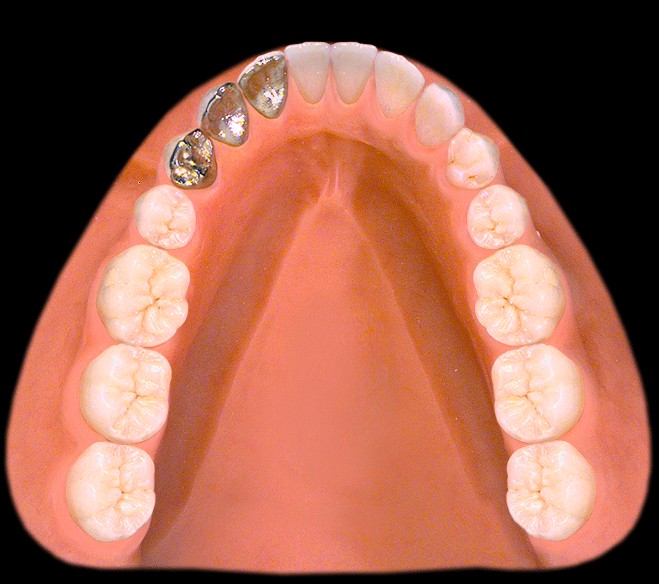 Versorgung der Lücke mit einer Brücke, die vestibulär ( außen ) verblendet ist ( bis zur vorgeschriebenen Verblendgrenze = im Unterkiefer Zahn 4 und im Oberkiefer Zahn 5 ). Die weiter hinteren Kronen bestehen aus einer Metallegierung.