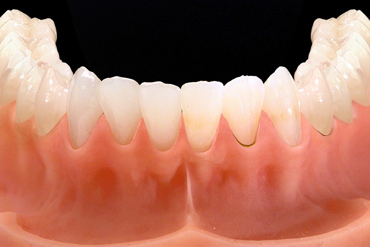 Versorgung der Lücke mit einer Brücke, die aus Vollkeramik angefertigt ist. Metallanteile sind nicht sichtbar, da kein Metall verarbeitet wird.