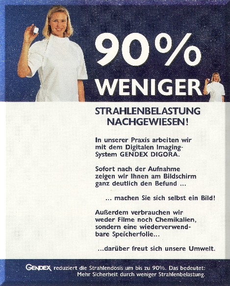 Durch das digitale Röntgenverfahren ist es möglich, die Strahlenexposition des Patienten um 90% zu senken. Der Computersensor ist wesentlich empfindlicher als ein herrkömmlicher Röntgenfilm und so kann die Strahlenexposition wesentlich gesenkt werden.
