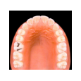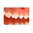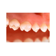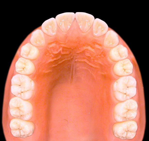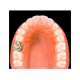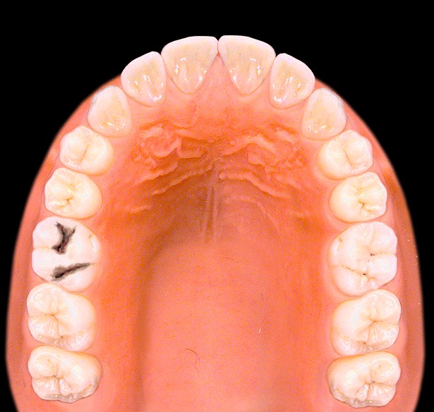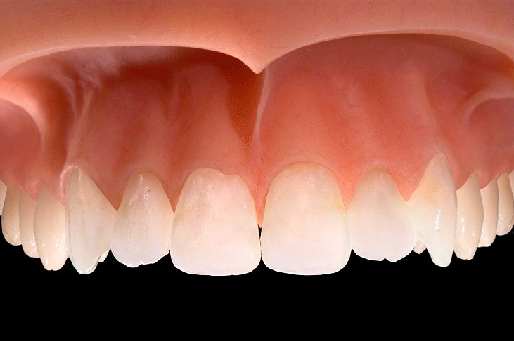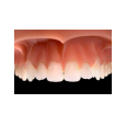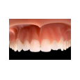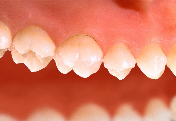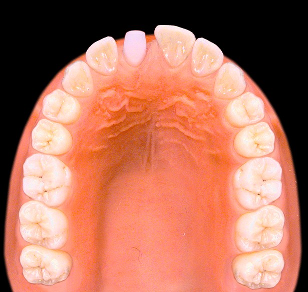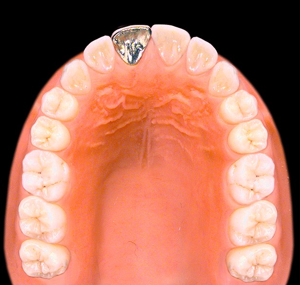 Der beschliffene Zahn wurde mit einer vestibulären Verblendung versorgt. Dabei ist auf dem Grundgerüst aus Metall nur auf der vestibulären Seite die Krone verblendet. Nachteil: Metallanteil ist zu sehen.