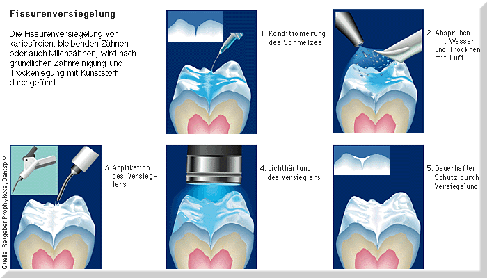 Der Zahnarzt verwendet bei der Fissurenversiegelung eine Art Kunststoff (Komposit), um die Vertiefungen an den Backenzähnen damit auszufüllen.Vor der Fissurenversiegelung werden die Kauflächen sehr gründlich mit feinen Bürsten gereinigt und von schädlichen Belägen befreit. Die Areale um die Fissuren werden mit einem speziellen Säuregel ein wenig aufgeraut, damit das Komposit besser daran haftet. Anschließend werden die Furchen getrocknet.Daraufhin werden die Fissuren mit Komposit gefüllt, der dann als „glatte“ Schutzschicht die Ansammlung von Bakterien verhindert und eine Zahnreinigung erleichtert. Durch Lichteinwirkung wird die neue Schicht zusätzlich gehärtet. Nach der Fissurenversiegelung kann eine Fluoridierung durchgeführt werden. Die Behandlung ist schmerzfrei.Besonders lohnt sich die Fissurenversiegelung bei schon bestehender Karies im Frühstadium. In diesem Fall muss der den Schmelz leicht mit dem Bohrer anfräsen. Anschließend die Behandlung wie oben erwähnt durchführen. Eine Versiegelung der Zähne wird empfohlen, wenn die Vertiefungen auf der Kaufläche besonders eng, tief und unregelmäßig sind.