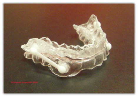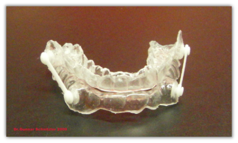 Der Silensor wird aus 2 transparenten Schienen ( Ober- und Unterkiefer ) und 2 Gelenkzügen an den Seiten der Schienen gefertigt. So kommt es zur Vorverlagerung des Unterkiefers und somit zur Erweiterung des Rachenraumes.