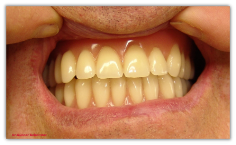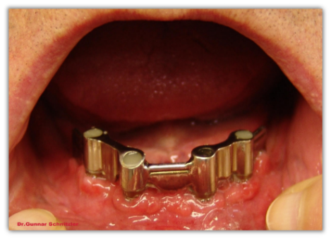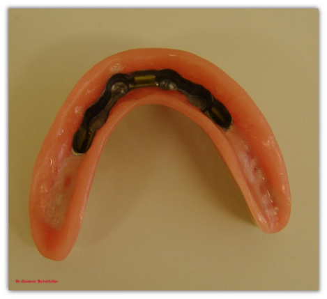 In den unbezahnten Kiefer wurden 4 Implantate ( = künstlichen Zahnwurzeln )eingesetzt. Auf diese Implantaten wurde ein Steg angefertigt, auf dem dann die Prothese sitzt.